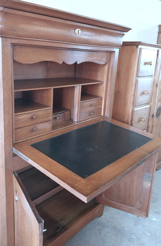 De kast is volledig nagekeken, waar nodig gerestaureerd en in de was gezet. Het blad van het uitklapbare bureau heeft een wat doorleefde uitstraling met hier en daar wat slijtage plekjes. Omdat er niet te hard op het blad geleund kan worden, is het niet geschikt om aan te werken, zoals bij een bureau.