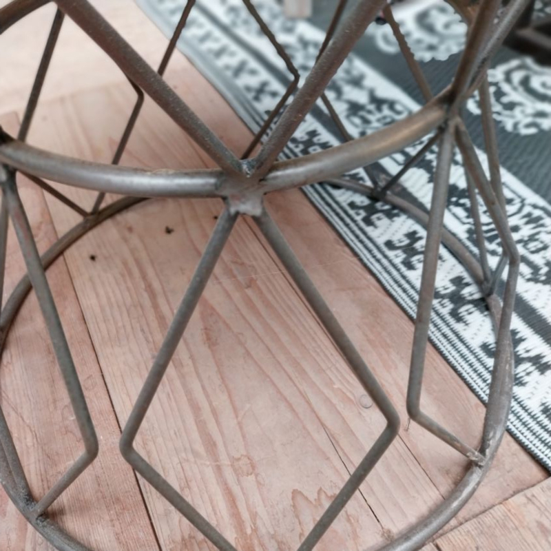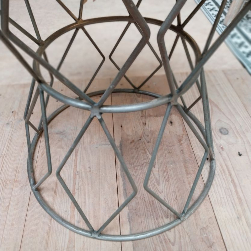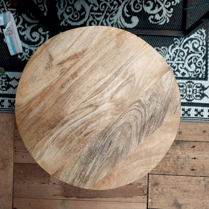 Artikelnummer: 5023 OverzichtCompact en stijlvol: deze ronde bijzettafel combineert een teakhouten blad met een opengewerkt metalen onderstel. Het onderstel heeft een vintage uitstraling met subtiele roestaccenten, wat zorgt voor een uniek en doorleefd karakter.