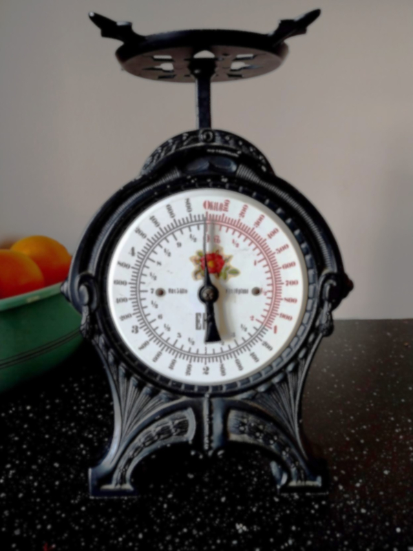 Oude gietijzeren keukenweegschaalBreng nostalgie in huis met deze originele oude keukenweegschaal. Vroeger onmisbaar in iedere keuken, vandaag de dag geliefd als decoratief pronkstuk. De weegschaal straalt vakmanschap en eenvoud uit, met zichtbare gebruikssporen…